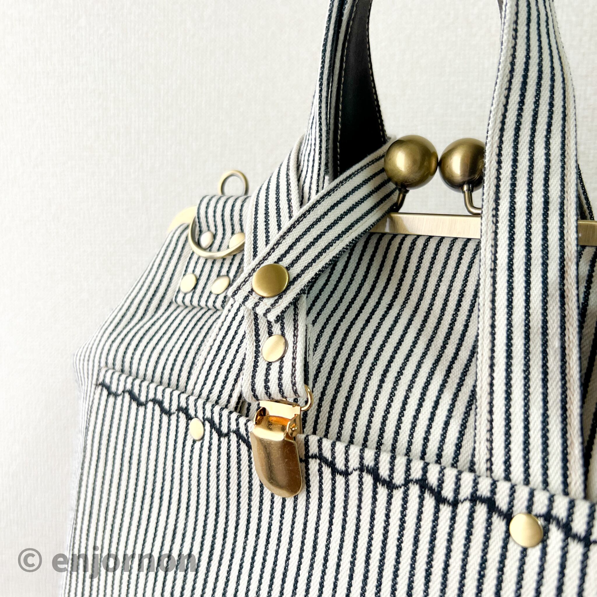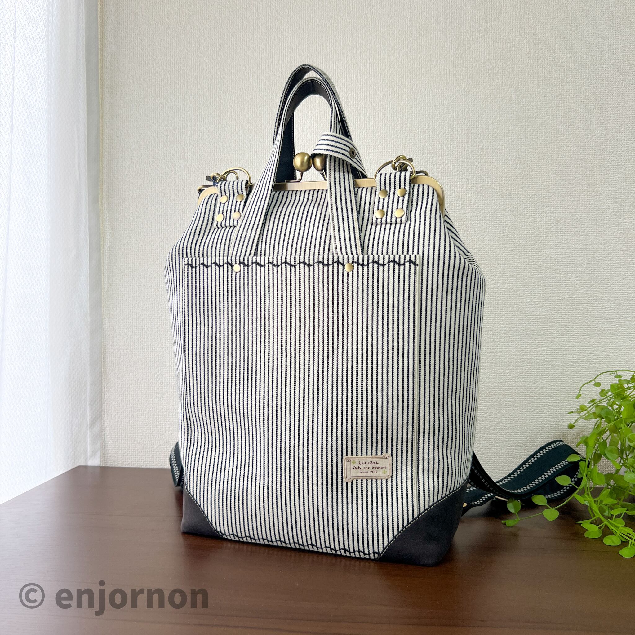 25cm口金のしっかりとした作りの3way がま口リュック。リュック、斜めがけ、肩掛けの3つのスタイルで使えるので、様々なシーンに対応できます。