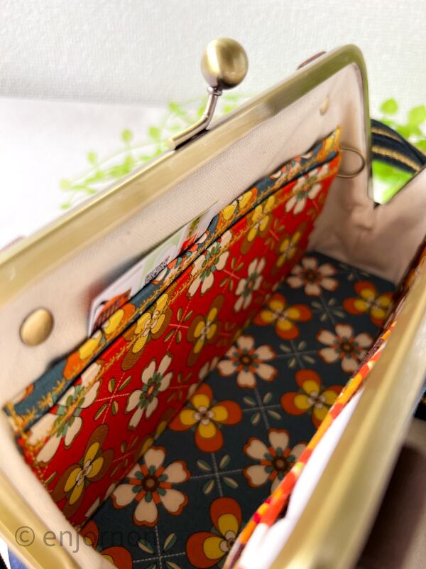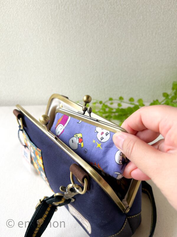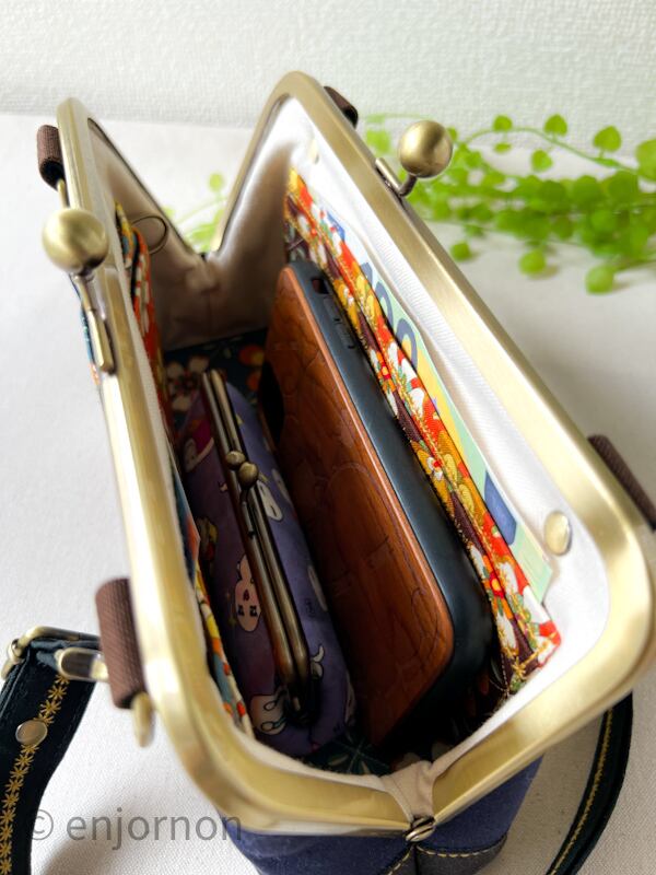 内ポケットにお札とカードを入れて、小銭はがま口の小銭入れをin!スマホも入るお財布バッグです(^^♪