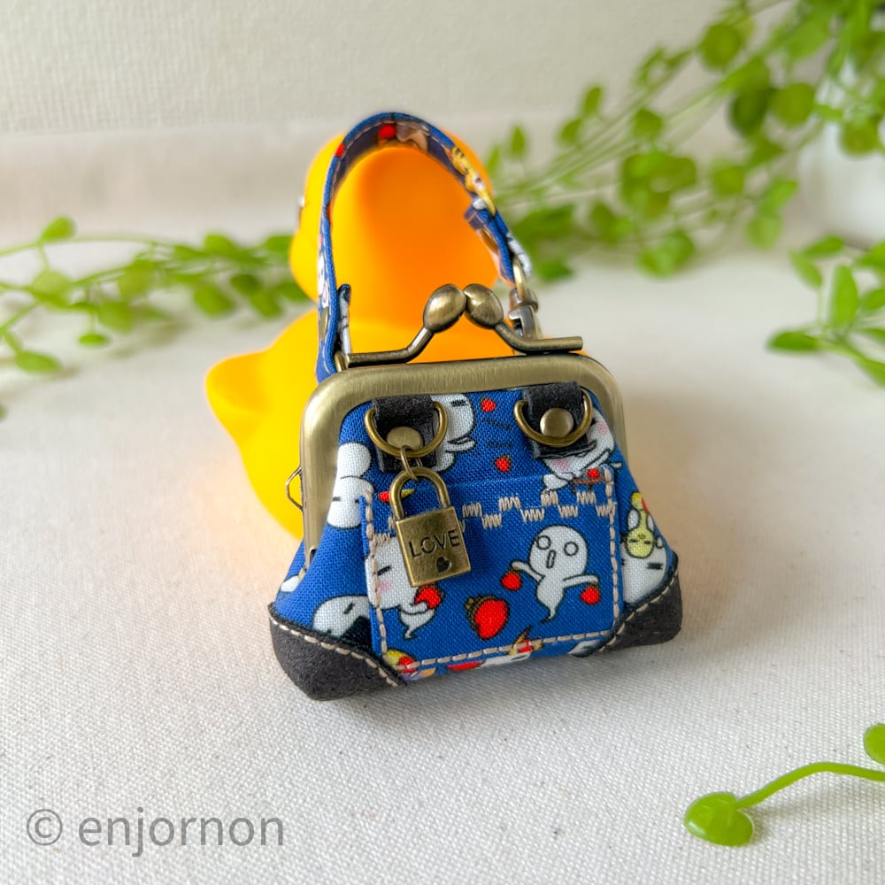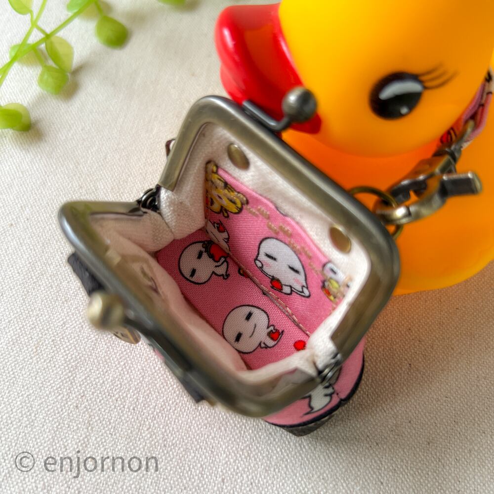 持ち手ストラップもゆーれいさんの生地を使用し、こんなに小さいのにいっちょ前に底角まで付け、中を開ければ内ポケットと底板と。。