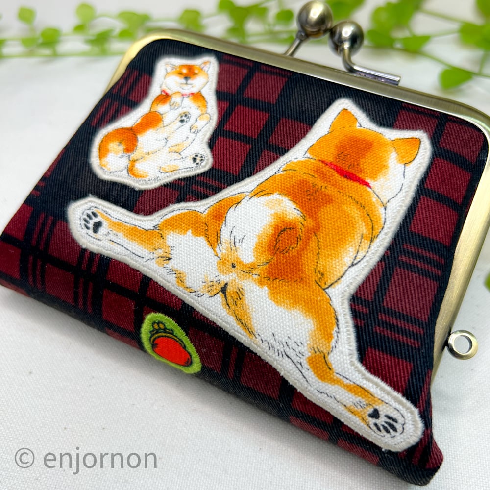 柴犬の可愛いハギレが勿体無いので、新たな作品に生まれ変わらせた逸品。レッドチェックの生地にミシンでパッチワークをした、珍しいがま口です。えんじょるのんの気合いが入った時だけ誕生しますので、ビビっときたら是非ゲットしてね!