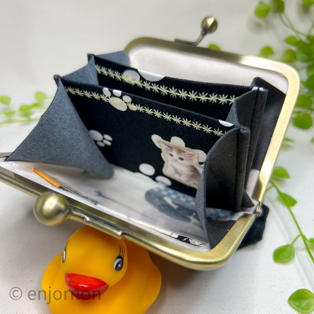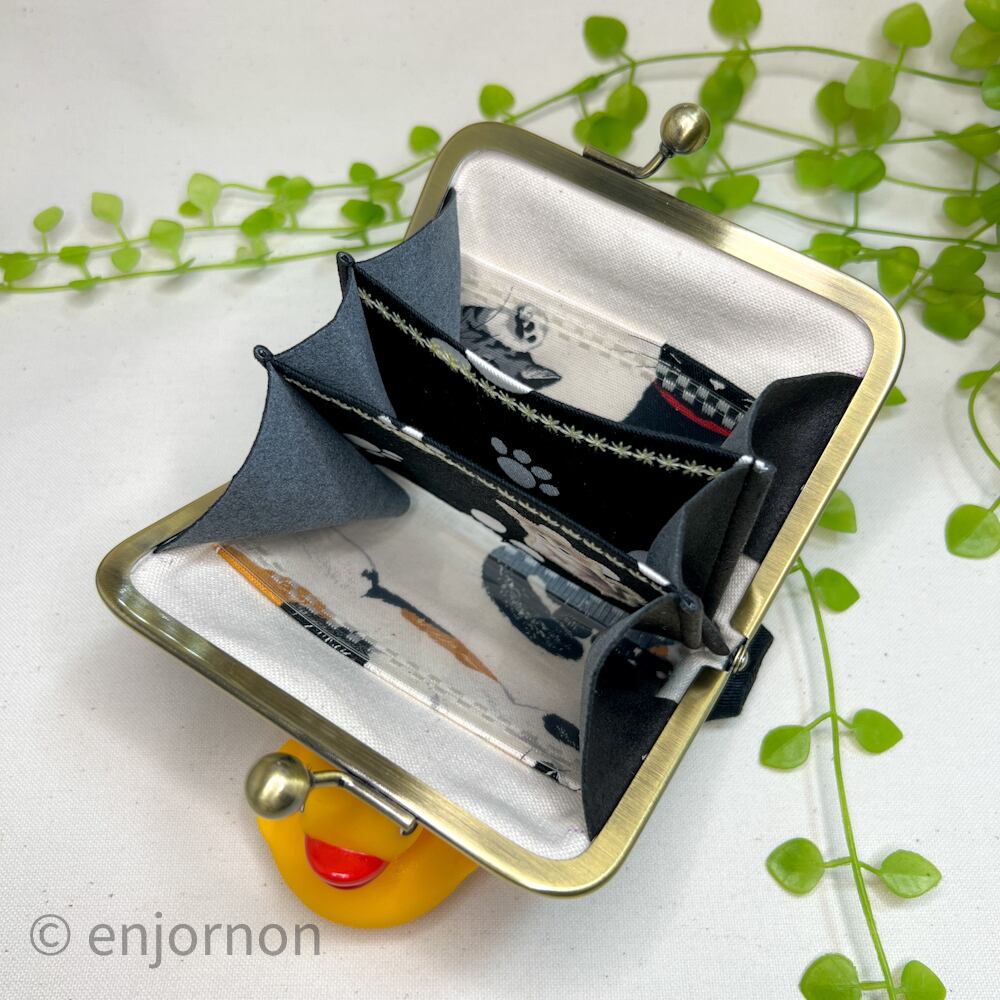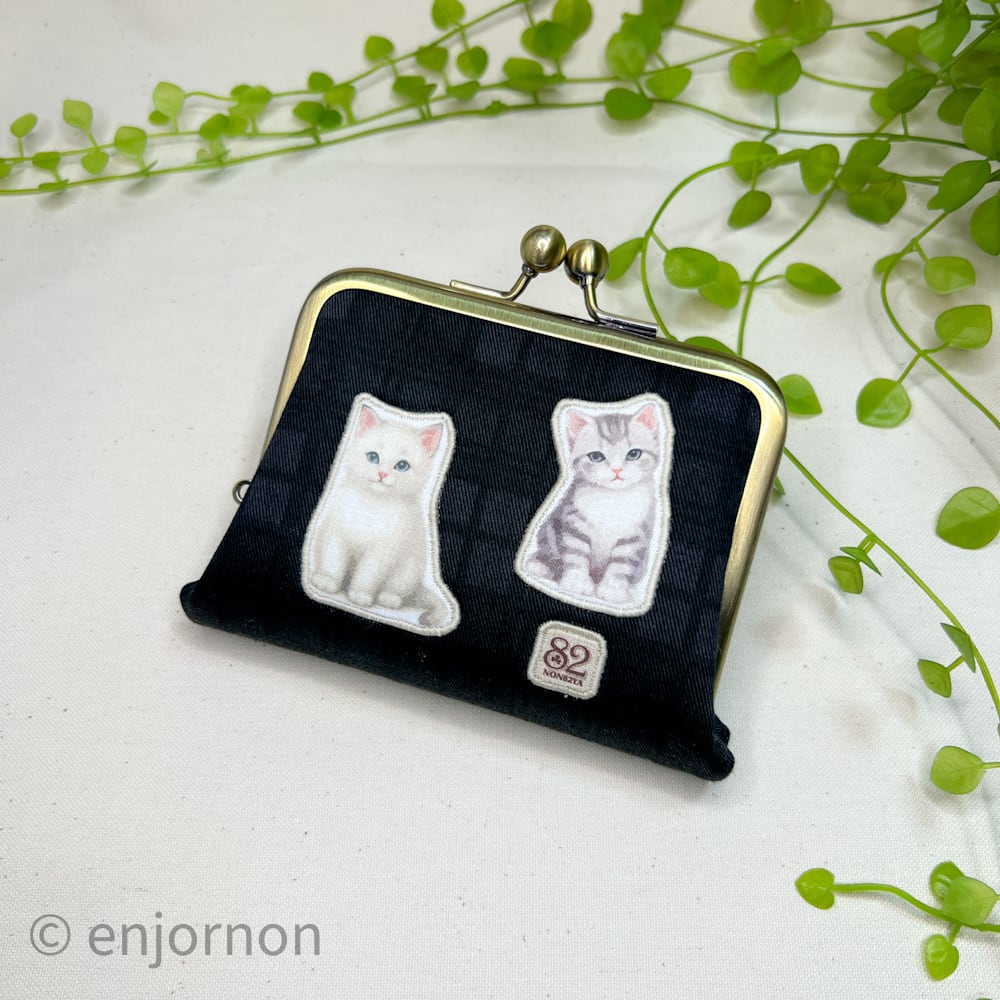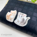 ほんわかしたにゃんこの可愛いハギレが勿体無いので、新たな作品に生まれ変わらせた逸品。ブラックチェックの生地にミシンでパッチワークをした、珍しいがま口です。仕切りにも猫ちゃんをアップリケしてある贅沢品♡