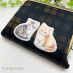 ほんわかしたにゃんこの可愛いハギレが勿体無いので、新たな作品に生まれ変わらせた逸品。オリーブチェックの生地にミシンでパッチワークをした、珍しいがま口です。仕切りにも猫ちゃんをアップリケしてある贅沢品♡